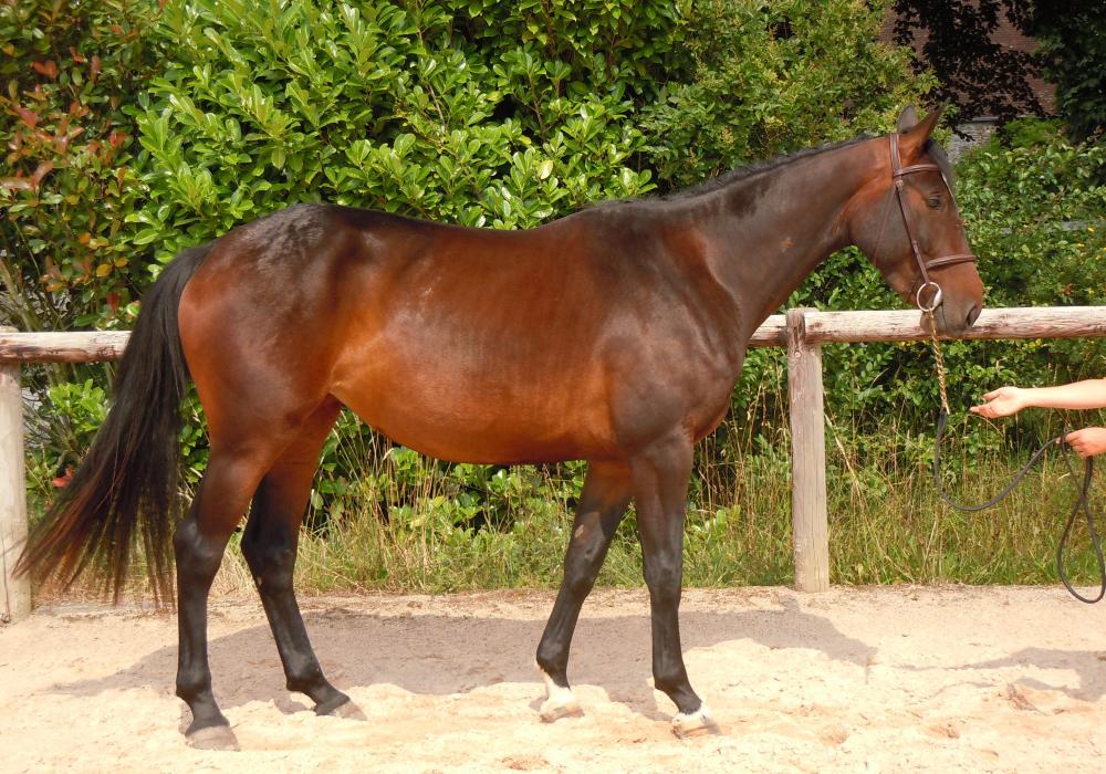 Femelle baie brune d'1m67, premier poulain de QUIETUDE TOURNERIE, dotée d'une bonne locomotion, très bien dans sa tête et démontrant à la fois force et souplesse à l'obstacle.